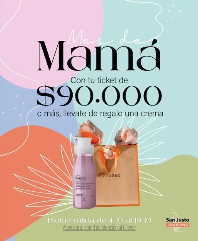 Hasta el 19 de octubre, quienes realicen compras por $90.000 o más y registren su ticket en la web https://sanjustoshopping.info/landing, podrán acercarse al Stand de Atención al Cliente y llevarse de regalo una crema Tododia de Natura, Mora Roja y Jabuticaba (400 ml).