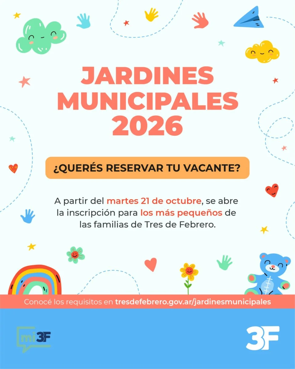 A través de sus redes sociales oficiales, desde el Municipio de Tres de Febrero, comunicaron que a partir del martes, 21 de octubre, abrirá la inscripción para el ciclo lectivo 2026 en los jardines municipales del partido.
