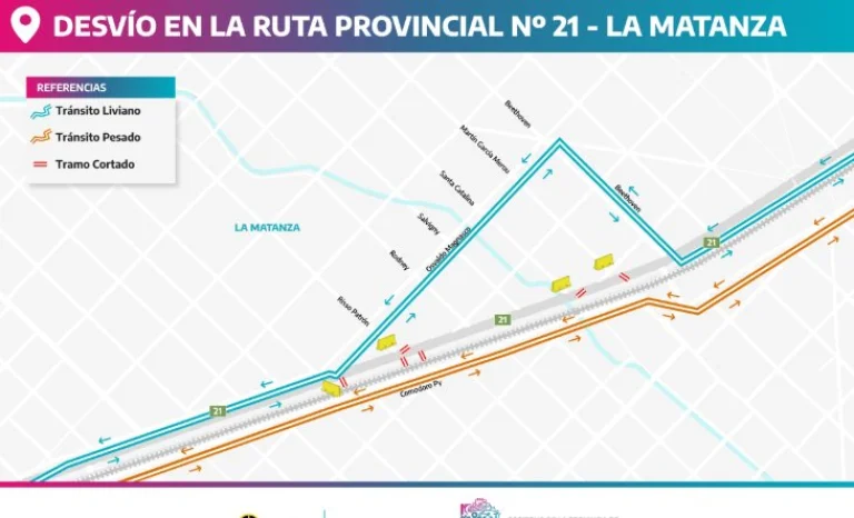 Desde la Dirección de Vialidad de la Provincia de Buenos Aires, dependiente del Ministerio de Infraestructura y Servicios Públicos, comunicaron que por trabajos hidráulicos sobre la cuenca del Arroyo Dupuy, hay desvíos y cortes de tránsito en la Ruta N°21, más precisamente en la localidad Gregorio de Laferrere, partido de La Matanza