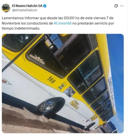 Desde la empresa El Nuevo Halcón S.A. comunicaron que los choferes de la Línea 148 "no prestarán servicio por tiempo indeterminado", desde las 00:00 horas de este viernes.