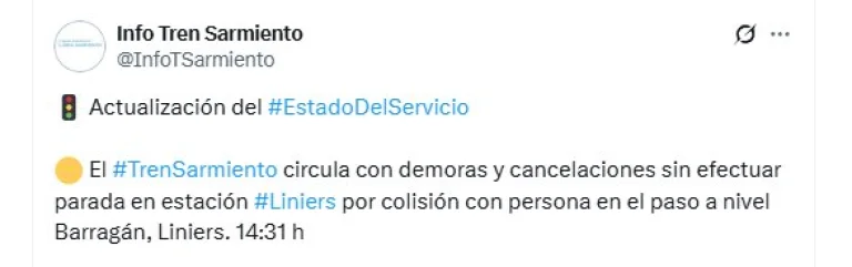 Desde la empresa estatal indicaron que "el Tren Sarmiento circula con demoras y cancelaciones sin efectuar parada en estación Liniers por colisión con persona en el paso a nivel Barragán, Liniers". Por el momento, se desconoce cuándo se normalizará el servicio.