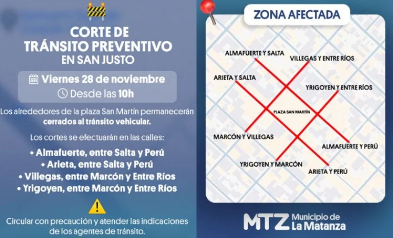 Desde las 10:00 horas de este viernes, 28 de noviembre, se realizan cortes de calle en el centro de San Justo por las inmediaciones de la Plaza San Martín, debido a obras que se llevan a cabo en la zona.