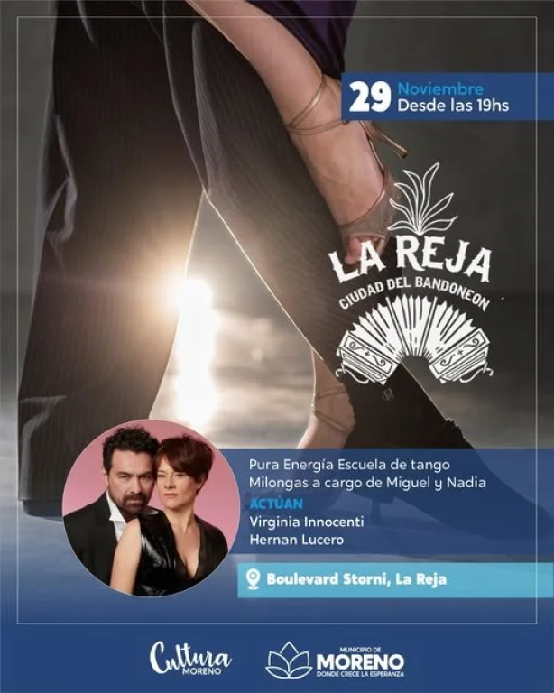 El sábado 29 de noviembre, desde las 19 horas, se realizará una nueva edición de "Sábado de Tango", en el boulevard Storni, en La Reja; a cargo de la escuela de tango Pura Energía. Del evento participarán Virginia Innocenti y Hernán Lucero.