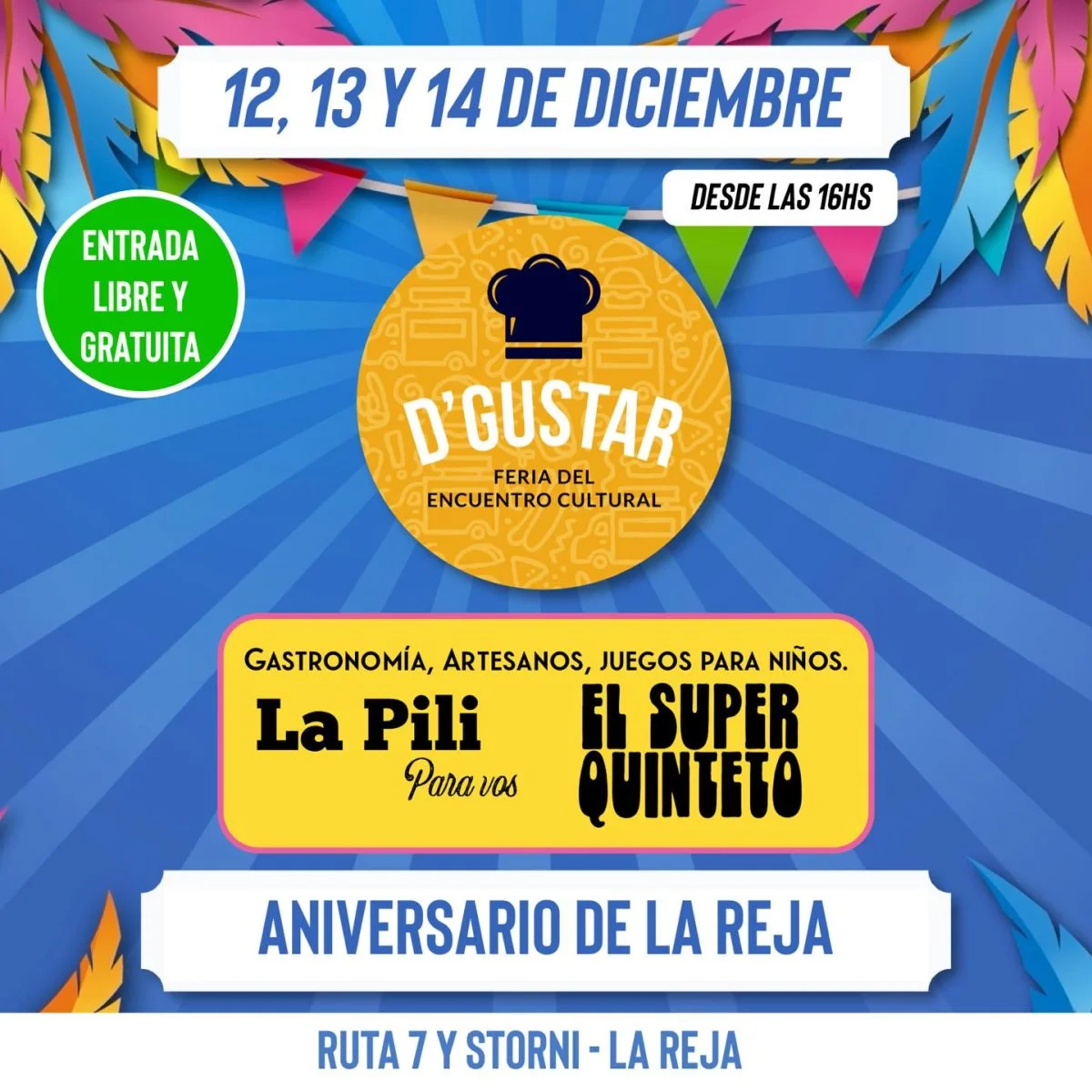 La celebración estará acompañada por la D'gustar Feria del Encuentro Cultural, que brindará durante los tres días entretenimiento para la familia, artesanos, juegos para niños y gastronomía del mundo. Además, estarán encargados del cierre musical, con los shows de La Pili Para Vos el domingo a las 20:00 horas y de El Súper Quinteto a las 21:00 hs.