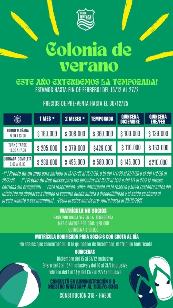 • Turno tarde de 13:30 a 17:30 hs: 1 mes $205.000, 2 meses $379.000, temporada $429.000, quincena diciembre $116.000, quincena enero-febrero $163.000.
