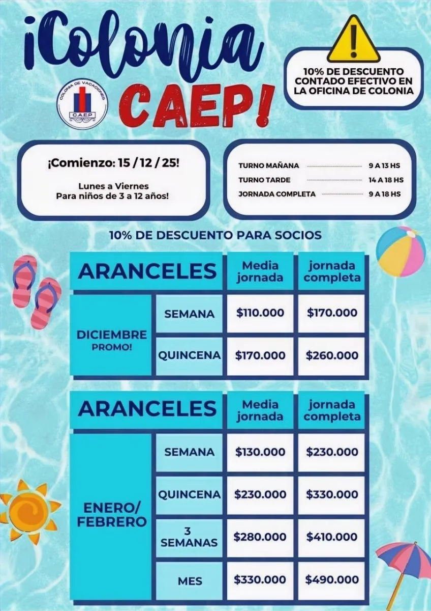 • Jornada completa de 09:00 a 17:30 hs: 1 mes $280.000, 2 meses $495.000, temporada $580.000, quincena diciembre $145.000, quincena enero-febrero $210.000.