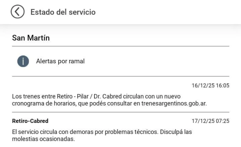 En concreto, para el Tren San Martín, que también está funcionando con un nuevo cronograma de horarios, indicaron que el servicio Retiro - Cabred "circula con demoras por problemas técnicos", y pidieron disculpas por las molestias ocasionadas.