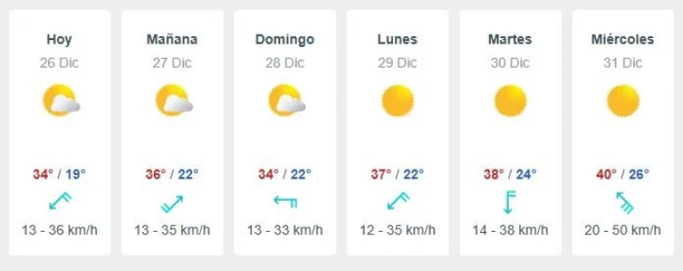 A partir de este viernes 26 de diciembre comenzará a incrementarse la temperatura alcanzando su pico máximo la jornada del miércoles 31 de diciembre con 40 grados de temperatura máxima con una mínima de 26.