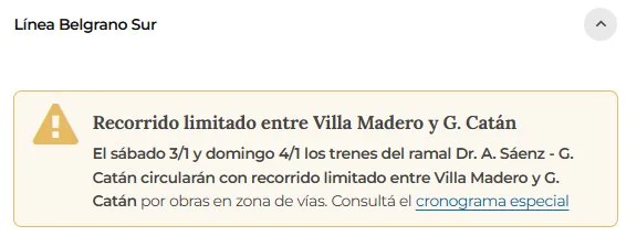 En concreto, desde la empresa estatal indicaron que "el sábado 3/1 y domingo 4/1 los trenes del ramal Dr. A. Sáenz - G. Catán circularán con recorrido limitado entre Villa Madero y G. Catán por obras en zona de vías".