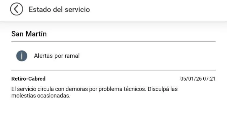 Respecto al Tren San Martín, indicaron que para el ramal Retiro - Cabred "el servicio circula con demoras por problemas técnicos", y pidieron disculpas por las molestias ocasionadas.