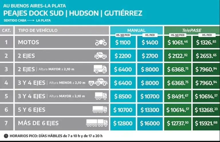En sentido contrario, desde la Ciudad hacia La Plata, los peajes de Dock Sud, Hudson, Gutiérrez y Villa Elisa tienen un costo máximo de $2.700 para pago manual y $2.653 mediante TelePASE durante la hora pico. En tanto, en las cabinas de Bernal, Quilmes y Berazategui, las tarifas ascienden a $1.900 en efectivo y $1.857 para quienes utilizan el sistema automático.