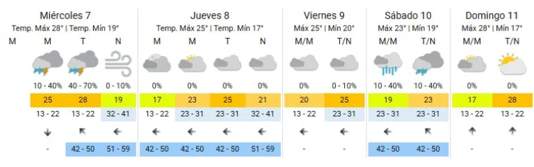 En tanto, el viernes el clima tenderá a estabilizarse. Se prevé cielo algo nublado, temperaturas que irán de los 20°C a los 25°C, y nuevamente viento del sudeste, sin probabilidad de lluvias.
