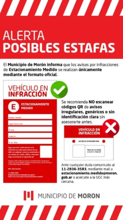 En las últimas horas, las autoridades de Morón advirtieron a la comunidad por una posible estafa al momento de visualizar una infracción de tránsito. Se trata de un volante que simula tener información sobre la multa, pero que en realidad al escanear el QR, la persona sin saberlo brinda sus datos a un desconocido.