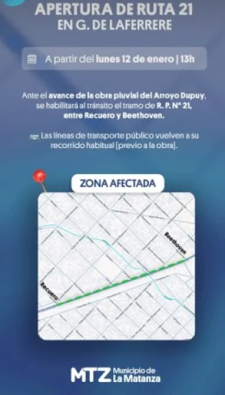 Desde el área Tránsito y Transporte del Municipio explicaron que "a partir del lunes 12 de enero, ante el avance de la obra pluvial del Arroyo Dupuy, se habilitará al tránsito el tramo de R.P. N°21, entre Recuero y Beethoven", e indicaron que las líneas de colectivo volverán a su recorrido habitual previo a la obra.