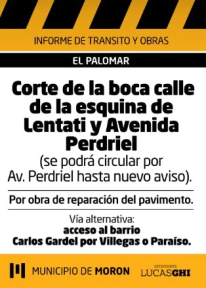 A través de sus redes sociales oficiales, el Municipio de Morón informó que se encuentra interrumpido el tránsito en la boca calle ubicada en la intersección de Lentati y la Avenida Perdriel, en la localidad de El Palomar, debido a una obra de reparación del pavimento.