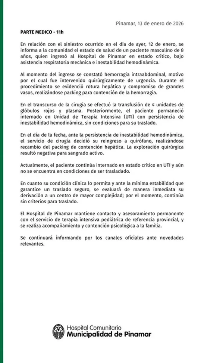 Además, explicaron que el menor se encuentra bajo asistencia respiratoria mecánica e inestabilidad hemodinámica y que, al momento del ingreso, se constató una hemorragia intraabdominal, motivo por el cual fue intervenido quirúrgicamente de urgencia.