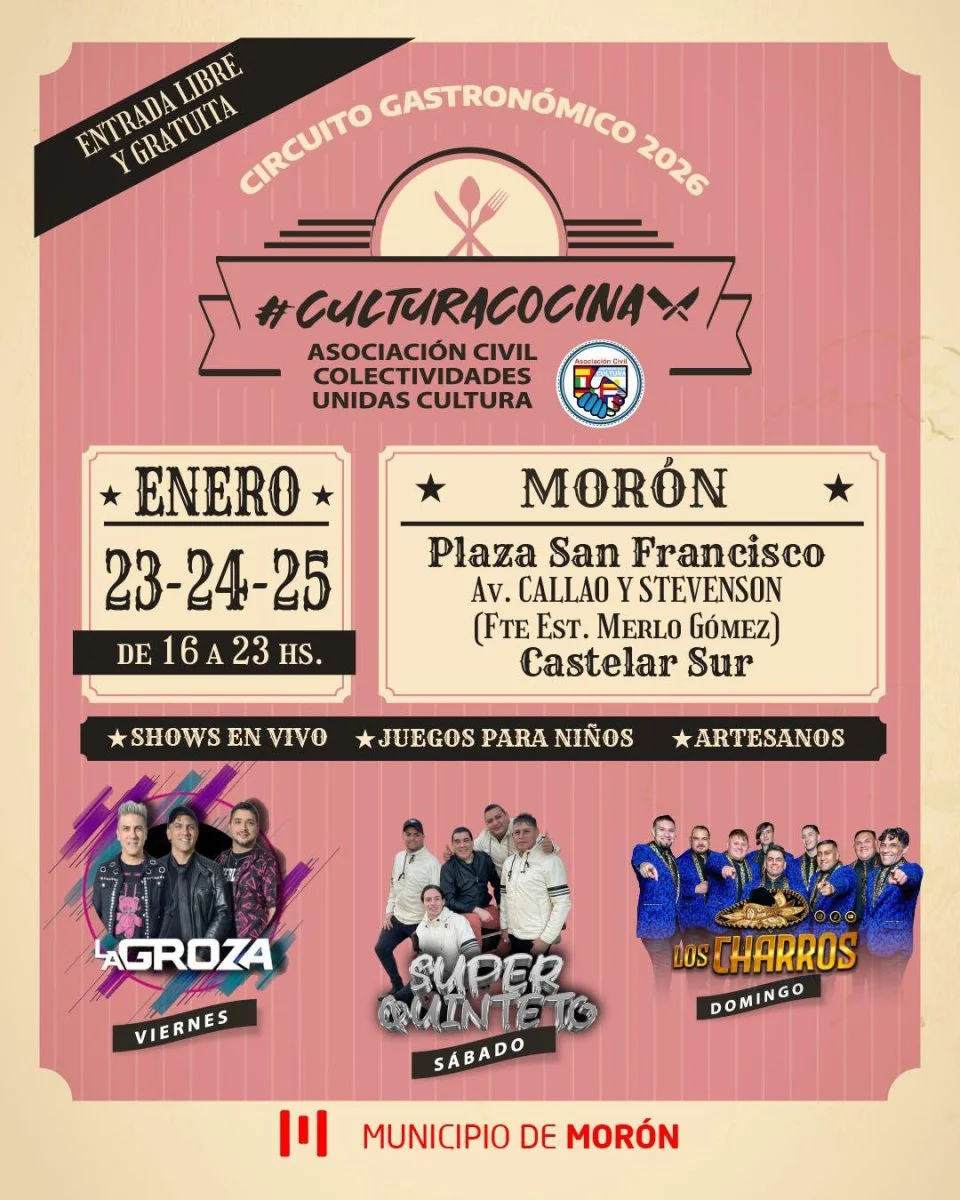 En la Plaza San Francisco de Morón, ubicada en Av. Callao y Stevenson (frente a la estación Merlo Gómez), de 16:00 a 23:00 horas se realizará el Festival Cultura Cocina, un evento para toda la familia en el que la gastronomía y la cultura se encuentran para acercar a los vecinos originales propuestas gourmet, actividades recreativas y espectáculos artísticos.