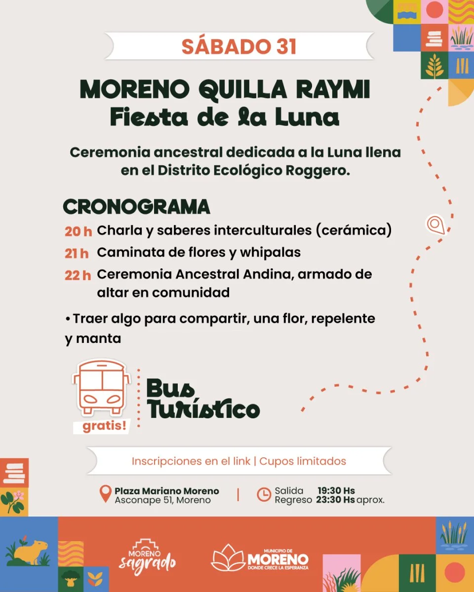 La primera de las salidas será "Moreno Quilla Raymi, Fiesta de la Luna", una ceremonia ancestral dedicada a la luna llena que se llevará a cabo este sábado 31 de enero, en el Distrito Ecológico Roggero. La actividad propone reconectar con los ciclos naturales y con las tradiciones originarias del territorio, mediante la experiencia guiada por un grupo de mujeres del área de identidad cultural.