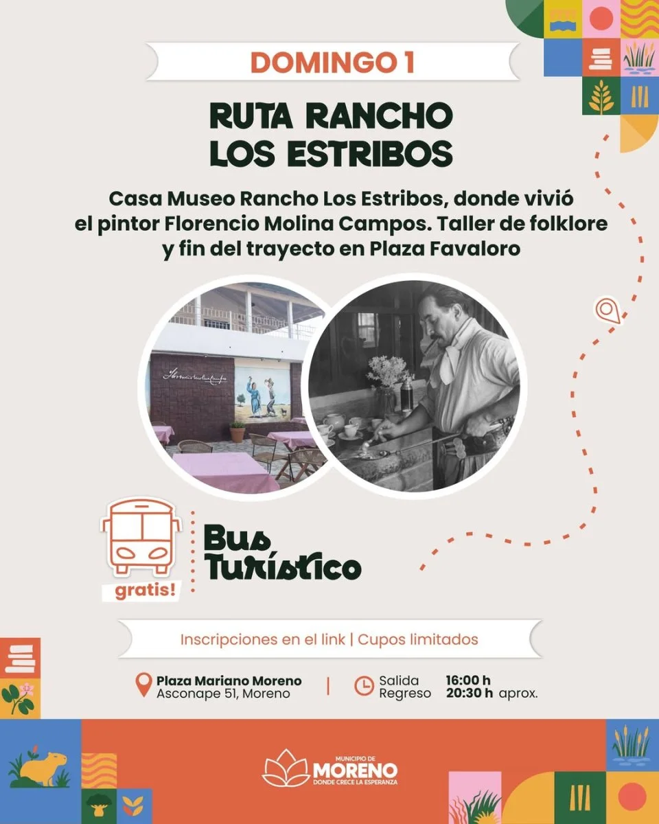 La segunda actividad tendrá lugar el domingo 1° de febrero y estará orientada a disfrutar de una tarde cultural y recreativa en el Rancho Los Estribos, casa museo donde vivió el reconocido pintor costumbrista Florencio Molina Campos. La jornada incluirá una visita guiada por el espacio, un taller de danzas folklóricas y un cierre al aire libre con tiempo para compartir mates y disfrutar del entorno natural.