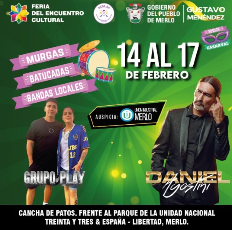 Este fin de semana, llegan los carnavales a diferentes partidos del Oeste y desde el Municipio de Merlo anunciaron que tendrán shows en vivo de Daniel Agostini y Grupo Play para cerrar la celebración a lo grande.