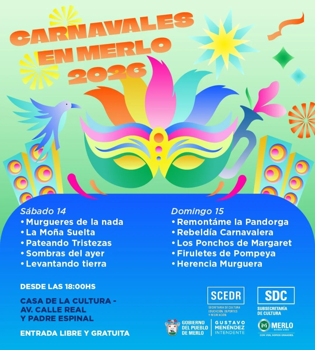 También del sábado 14 al martes 17 de febrero desde las 18:00 horas habrá celebraciones en la Casa de la Cultura de Merlo, ubicada en Av. Calle Real y Padre Espinal con entrada libre y gratuita. "Te esperamos en familia para disfrutar de grandes espectáculos, con las mejores murgas y bandas en vivo, en la temporada de carnavales", expresaron desde el Municipio.
