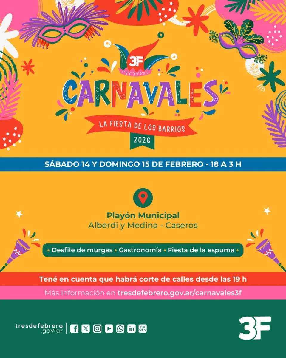 La magia de los carnavales llega este fin de semana a Tres de Febrero, con dos jornadas a pura fiesta para compartir en familia y con amigas "en una celebración única llena de ritmo y color". Desde el Municpio invitaron a los vecinos este sábado 14 y domingo 15 de 18:00 a 03:00 hs al Playón Municipal de Caseros (Alberdi y Medina).