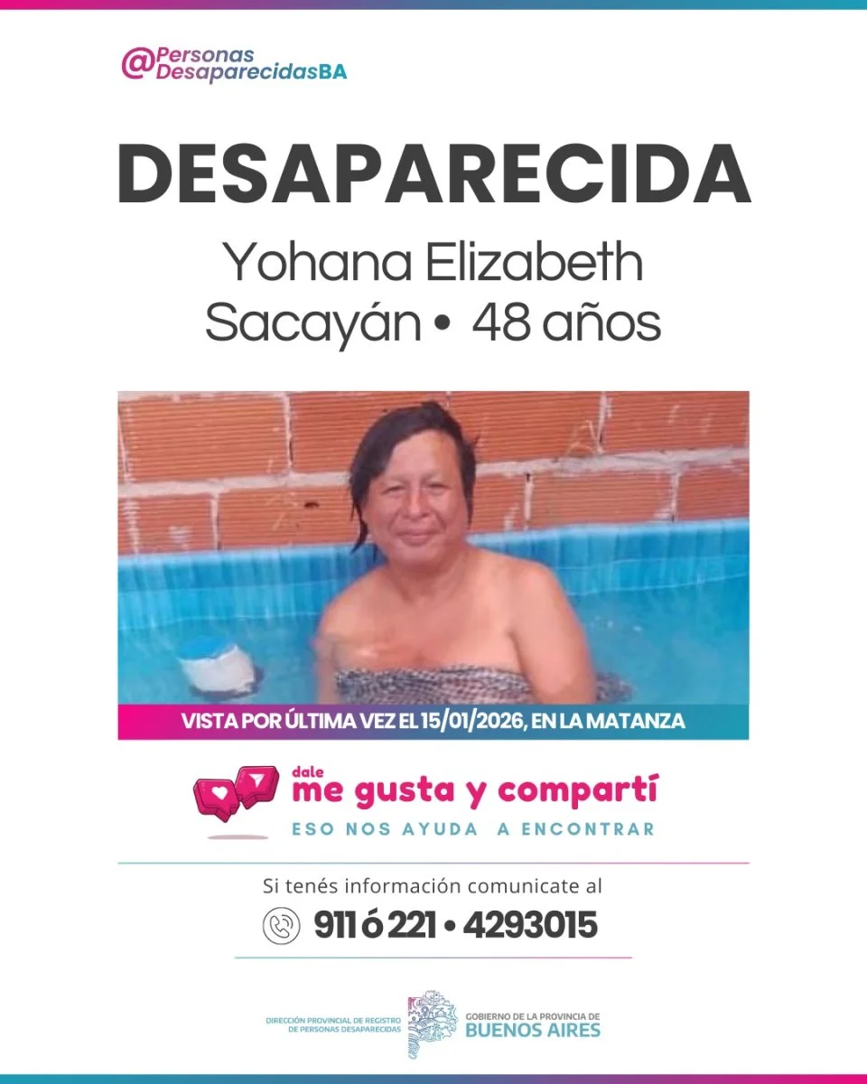 Desde el organismo indicaron que Yohana tiene 48 años y fue vista por última vez el jueves 15 de enero en la localidad de Gregorio de Laferrere, en el partido de La Matanza cuando se dirigía hacia la costa bonaerense, podría ser Mar del Plata o Chapadmalal.