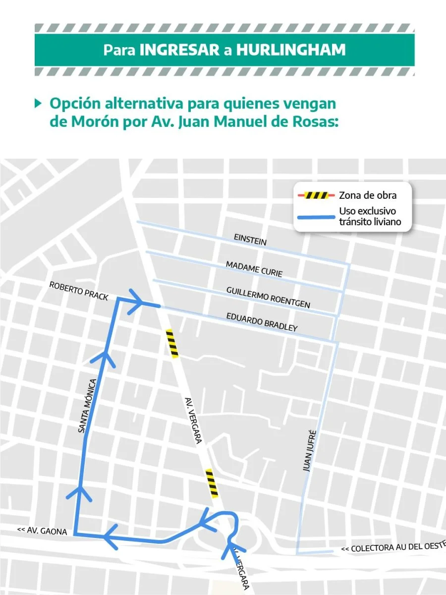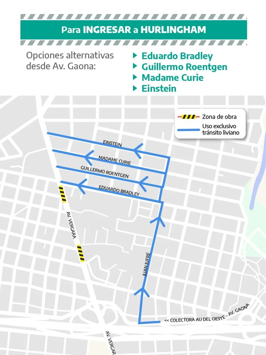 Por otro lado, para ingresar a Hurlingham, las opciones alternativas desde Gaona son: Eduardo Bradley, Guillermo Roentgen, Madame Curie y Einstein, también para uso exclusivo de tránsito liviano.