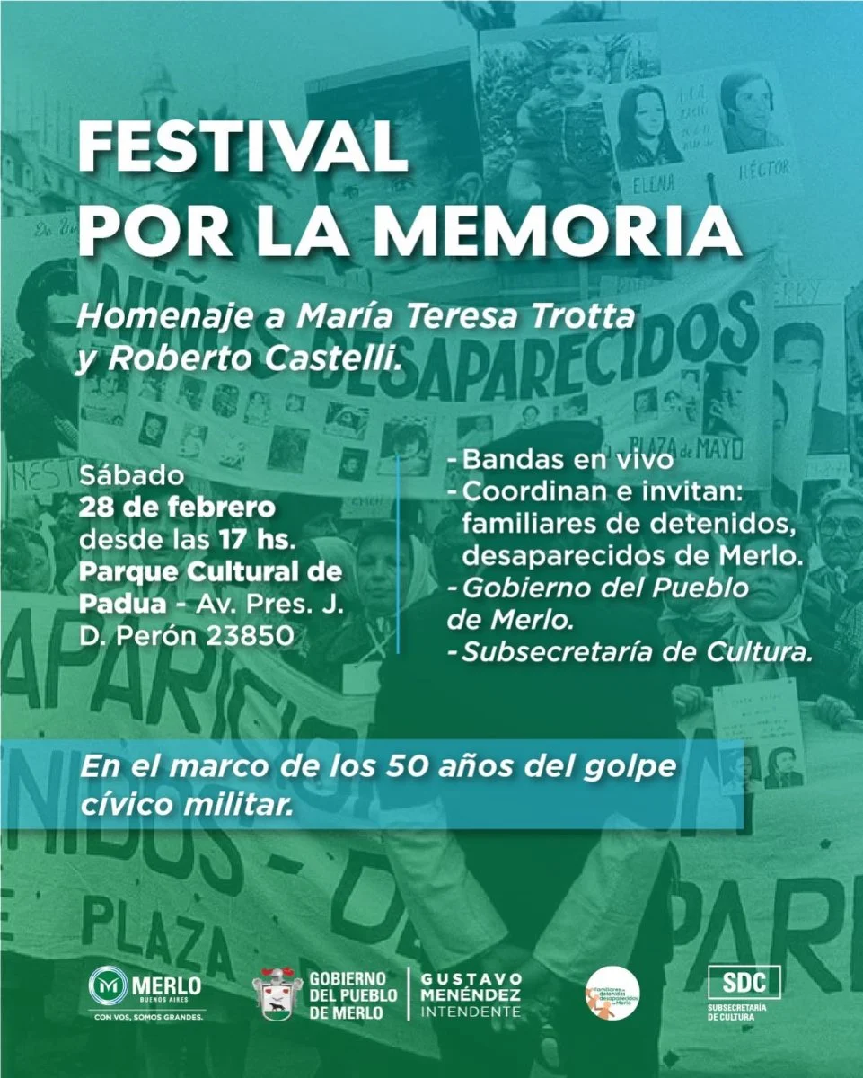 Este sábado 28 de febrero desde las 17:00 horas, en el Parque Cultural de Padua, ubicado en Av. Presidente J. D. Perón 23850, se realizará un festival por la memoria. "En marzo se cumplirán 50 años del golpe cívico militar que sumió a la Argentina en una época oscura y atroz; y en Merlo este sábado 28 de febrero honraremos la memoria de víctimas del genocidio", expresaron desde la organización.