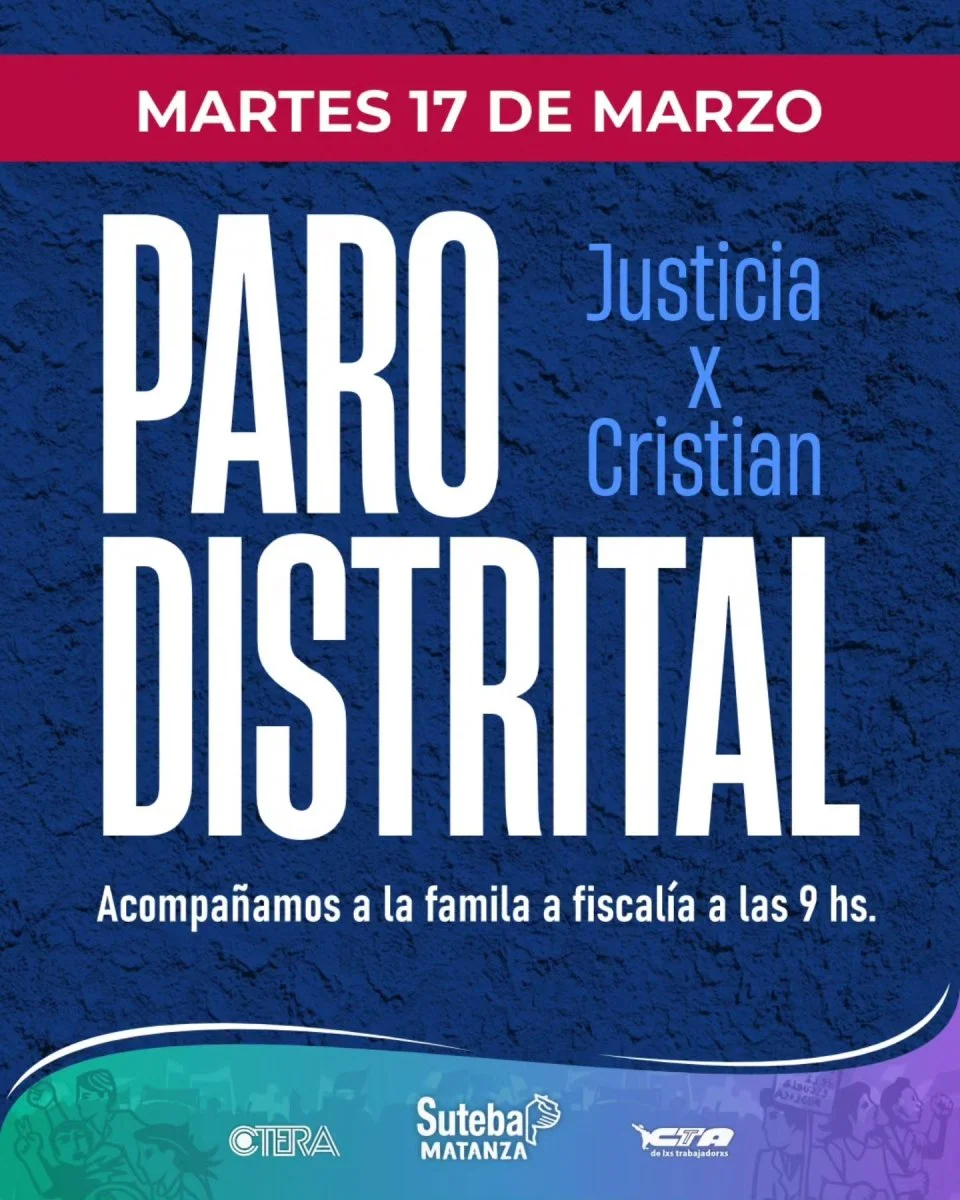 Frente a esto, desde Suteba Matanza realizan un "paro distrital y acompañamiento a la familia a la físcalia de homicidios. Justicia por Cristian".