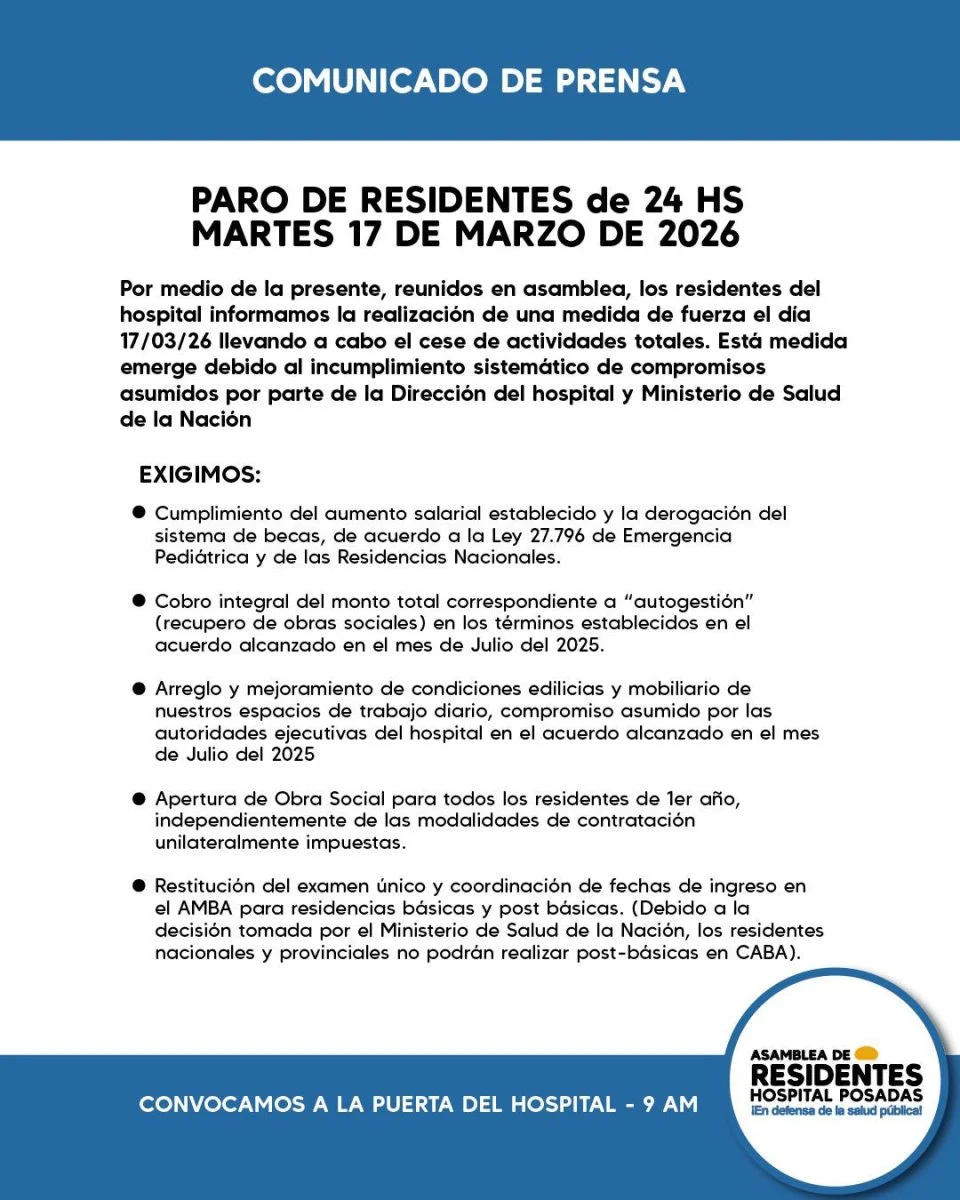 Los residentes del Hospital Posadas llevan adelante este martes 17 de marzo un paro de 24 horas con cese total de actividades, en el marco de un reclamo por mejoras salariales, condiciones laborales y cumplimiento de acuerdos previos.