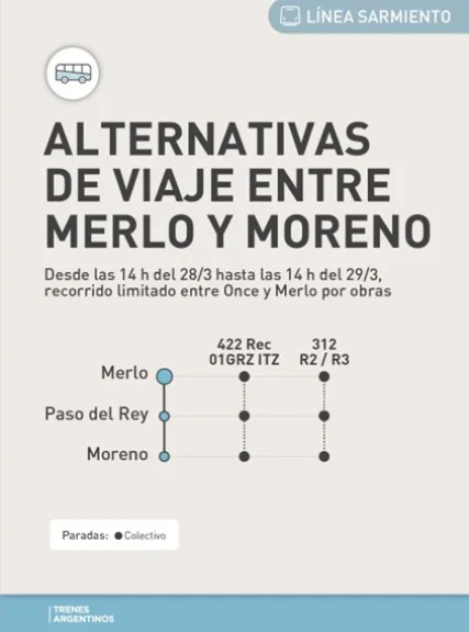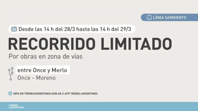 En este contexto, desde Trenes Argentinos explicaron que "por obras en zona de vías, desde el sábado 28/3 a las 14:00 horas hasta el domingo 29/3 a las 14:00 horas, el servicio del ramal Once - Moreno circulará con recorrido limitado entre Once y Merlo".