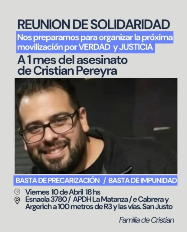 En ese marco, este viernes 10 de abril a las 18:00 horas se realizará una reunión abierta en Esnaola 3780, San Justo, donde participarán organismos de derechos humanos, organizaciones sociales y la comunidad educativa. El objetivo será coordinar una movilización prevista para el próximo 15 de abril, cuando se cumpla un mes del crimen.