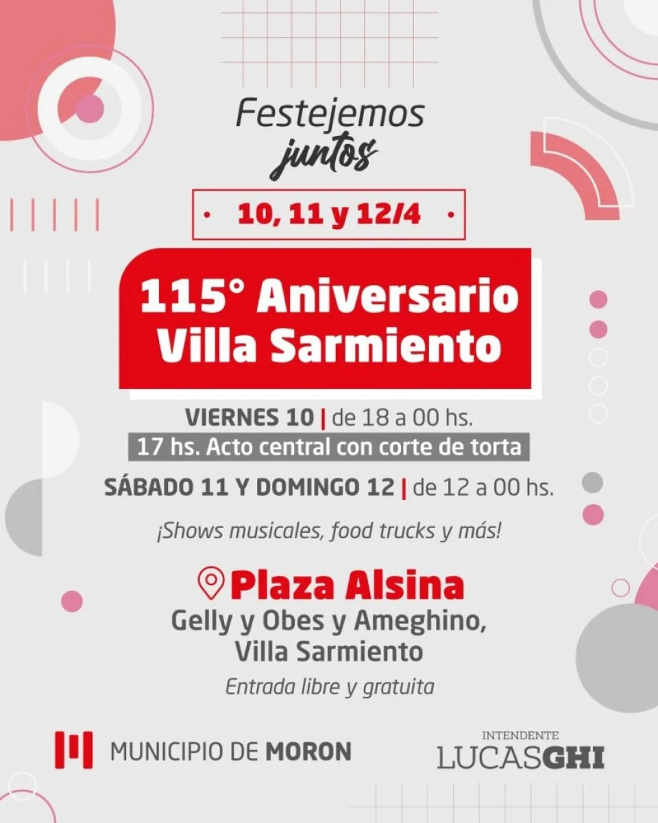La localidad de Villa Sarmiento se prepara para celebrar su 115° aniversario con una agenda de actividades abiertas a toda la comunidad. Para esto el Municipio de Morón organizará tres días de festejos, desde este vienres 10 al domingo 12 de abril, en la Plaza Alsina, ubicada en Gelly y Obes y Ameghino.