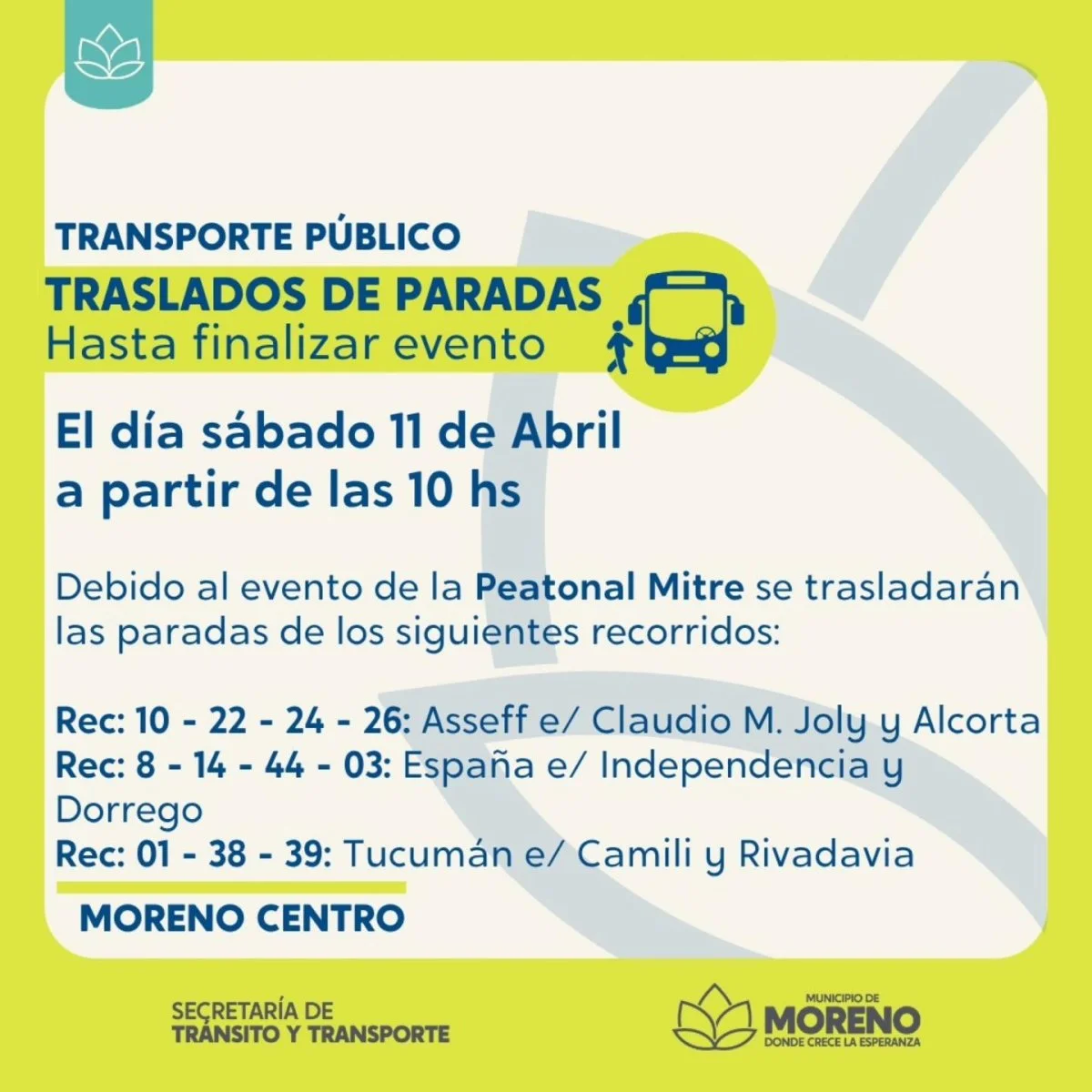 A través de sus redes sociales oficiales, la Secretaría de Tránsito y Transporte de Moreno, anunció que debido a una nueva edición de La Peatonal Mitre, habrá un corte sobre Av. Bme. Mitre y algunas paradas de colectivos serán desviadas.