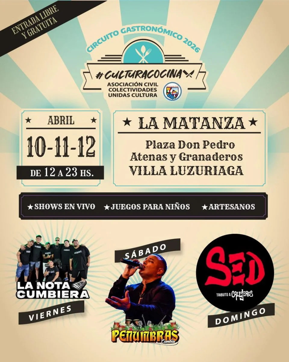También con entrada libre y gratuita, en la Plaza Don Pedro (Atenas y Granaderos), en Villa Luzuriaga, partido de La Matanza se llevará a cabo el Festival Cultura Cocina de 12:00 a 23:00 horas con shows en vivo, propuestas gourmet, actividades recreativas y espectáculos artísticos.