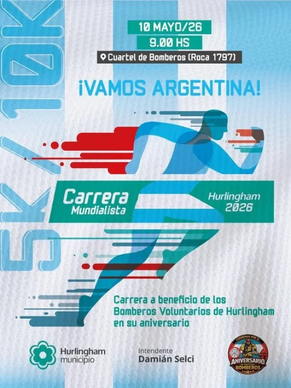El Municipio de Hurlingham anunció la realización de una nueva jornada deportiva y solidaria: la carrera participativa "Vamos Argentina 2026", un evento que combinará actividad física y compromiso comunitario en beneficio de los Bomberos Voluntarios del distrito.