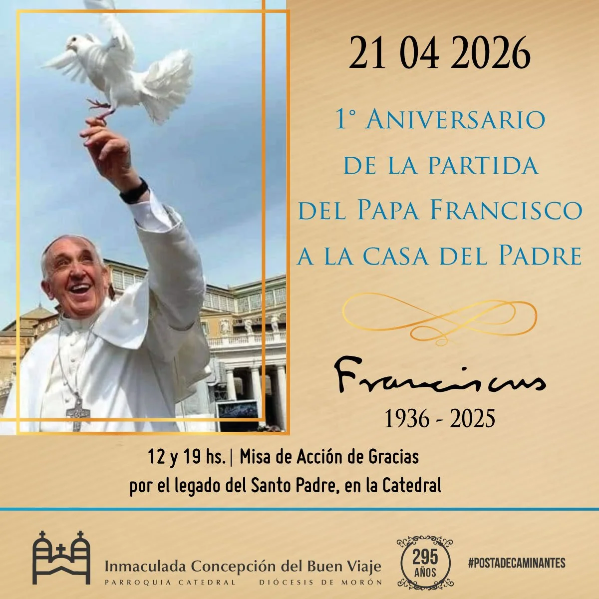 Desde el Obispado de Morón, que también integra a los municipios de Hurlingham e Ituzaingó, invitaron a la comunidad a participar de la Misa de Acción de Gracias a las 12:00 y 19:00 horas "por el legado del Santo Padre", en la Parroquia Inmaculada Concepción del Buen Viaje Catedral de Morón este martes 21 de abril, ubicada en Nuestra Señora del Buen Viaje 929.