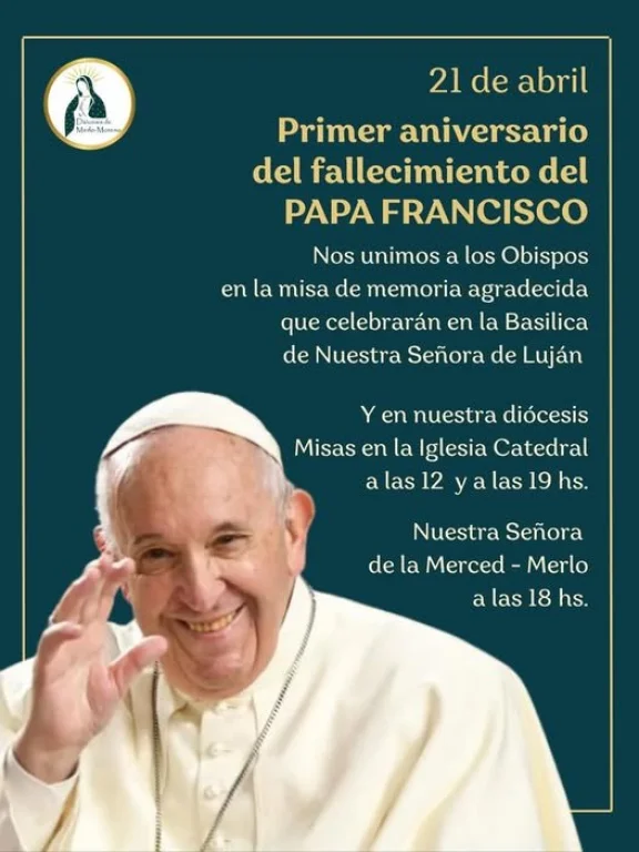 Por otro lado, la Diócesis de Merlo - Moreno comunicó que "en el primer aniversario de la partida del Papa Francisco a la casa del Padre, los invitamos a compartir las Misas de 12:00 y 19:00 hs. en la Iglesia Catedral de Nuestra Señora del Rosario - Moreno", este martes 21 de abril.