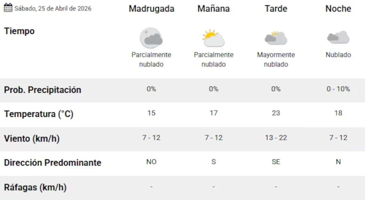 Para el sábado se espera una jornada relativamente estable, con cielo parcialmente nublado y temperaturas que oscilarán entre los 15°C de mínima y los 23°C de máxima. No se prevén lluvias durante el día, aunque hacia la noche podrían registrarse algunas condiciones de inestabilidad.