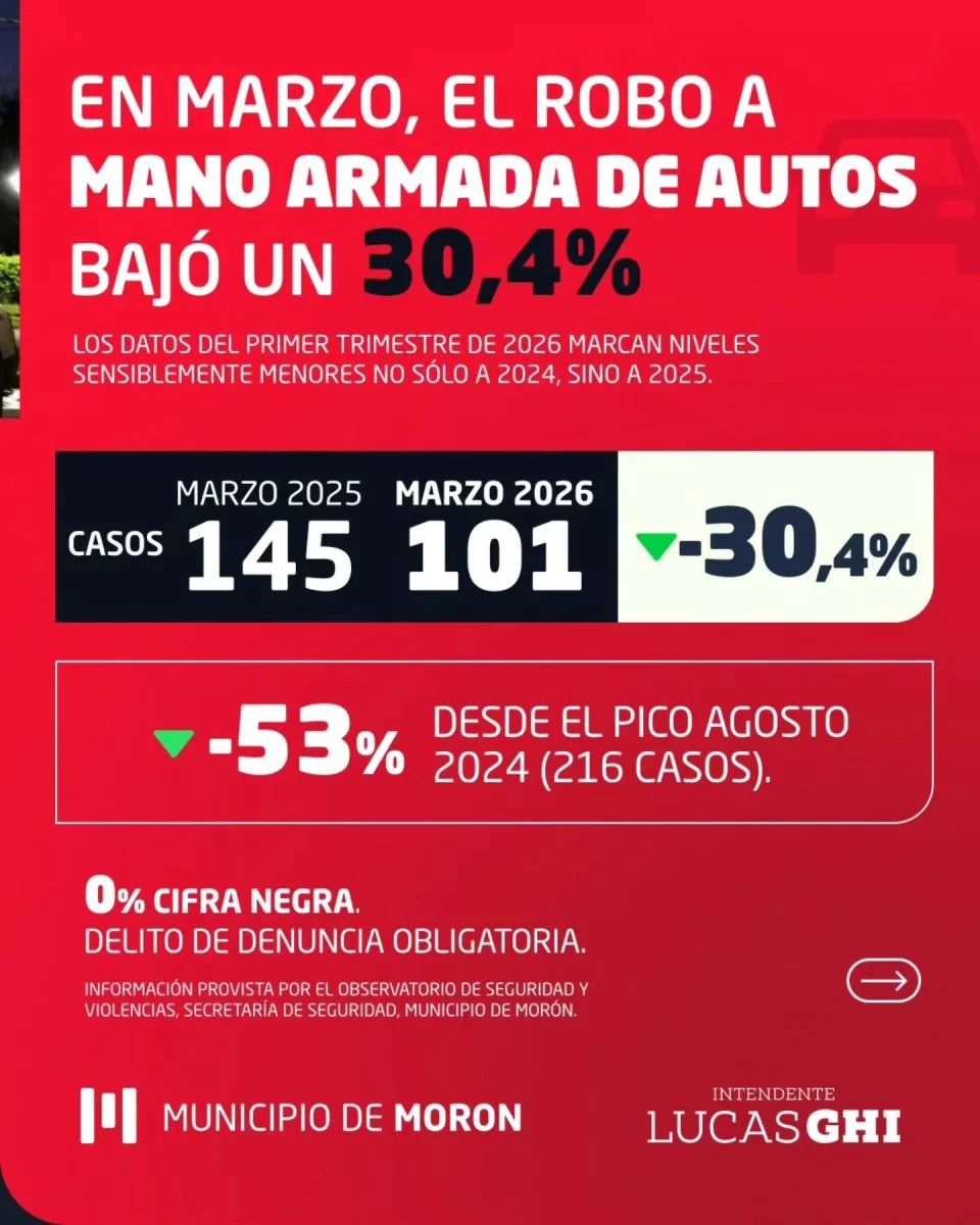 En las últimas horas, el Municipio de Morón difundió un informe con datos actualizados sobre seguridad en el distrito, donde se destaca una marcada disminución en los robos a mano armada de autos y motos en comparación al mismo período, del año anterior.
