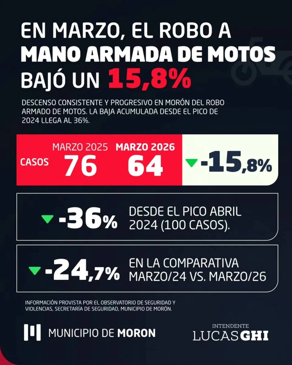De acuerdo a las estadísticas elaboradas por el Observatorio de Seguridad local, en marzo de 2026 el robo de motos a mano armada mostró una baja del 15,8% en comparación con el mismo mes del año anterior. En términos absolutos, los casos pasaron de 76 a 64 hechos.