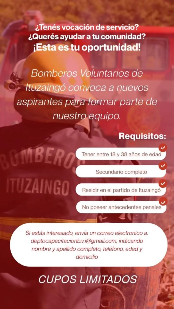 El cuartel de Bomberos Voluntarios de Ituzaingó lanzó una nueva convocatoria para incorporar aspirantes que deseen sumarse al cuartel y formar parte de su equipo de trabajo.